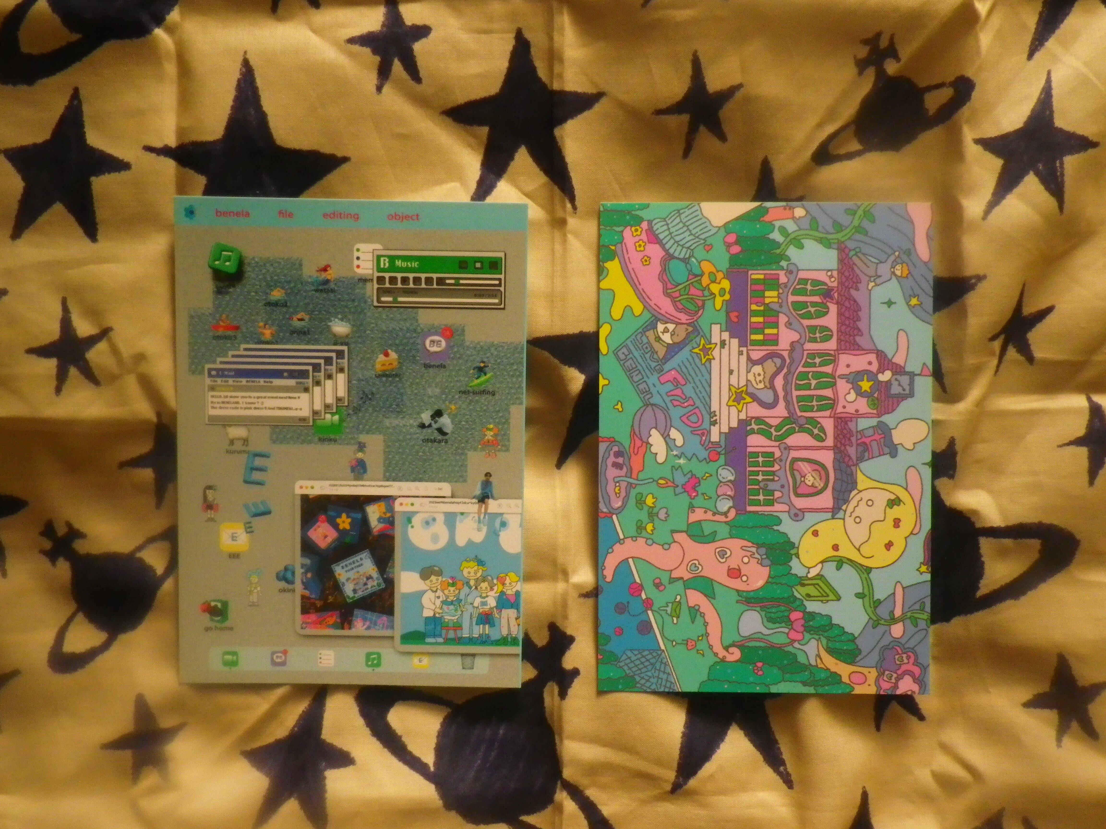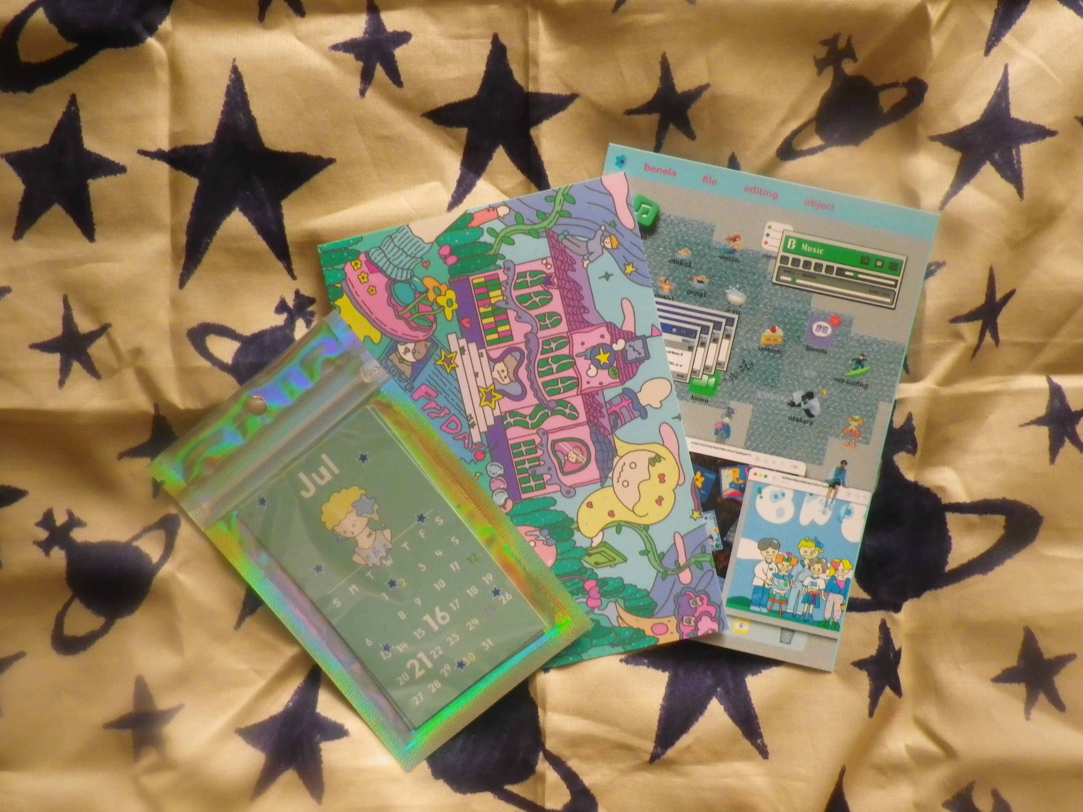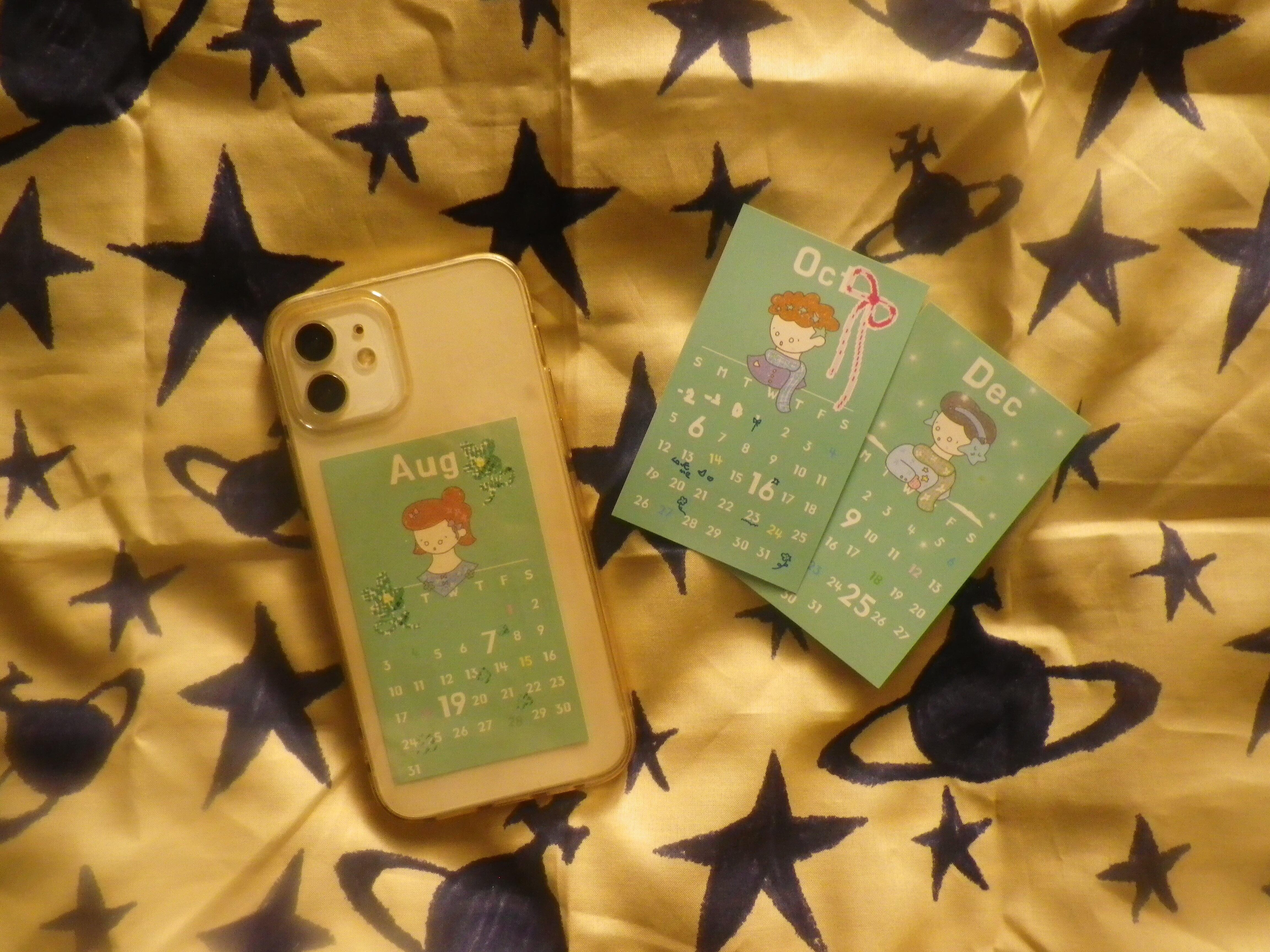 携帯に挟めるミニカレンダー(7月から12月まで)とポストカード2枚セット。